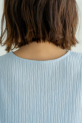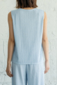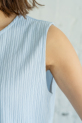 凹凸のある楊柳素材が肌離れよく、暑い季節でもさらりと快適に着用でき、ノースリーブでも肩まわりを程よくカバーしてくれる絶妙なバランスで、大人でも取り入れやすいデザインになっています。